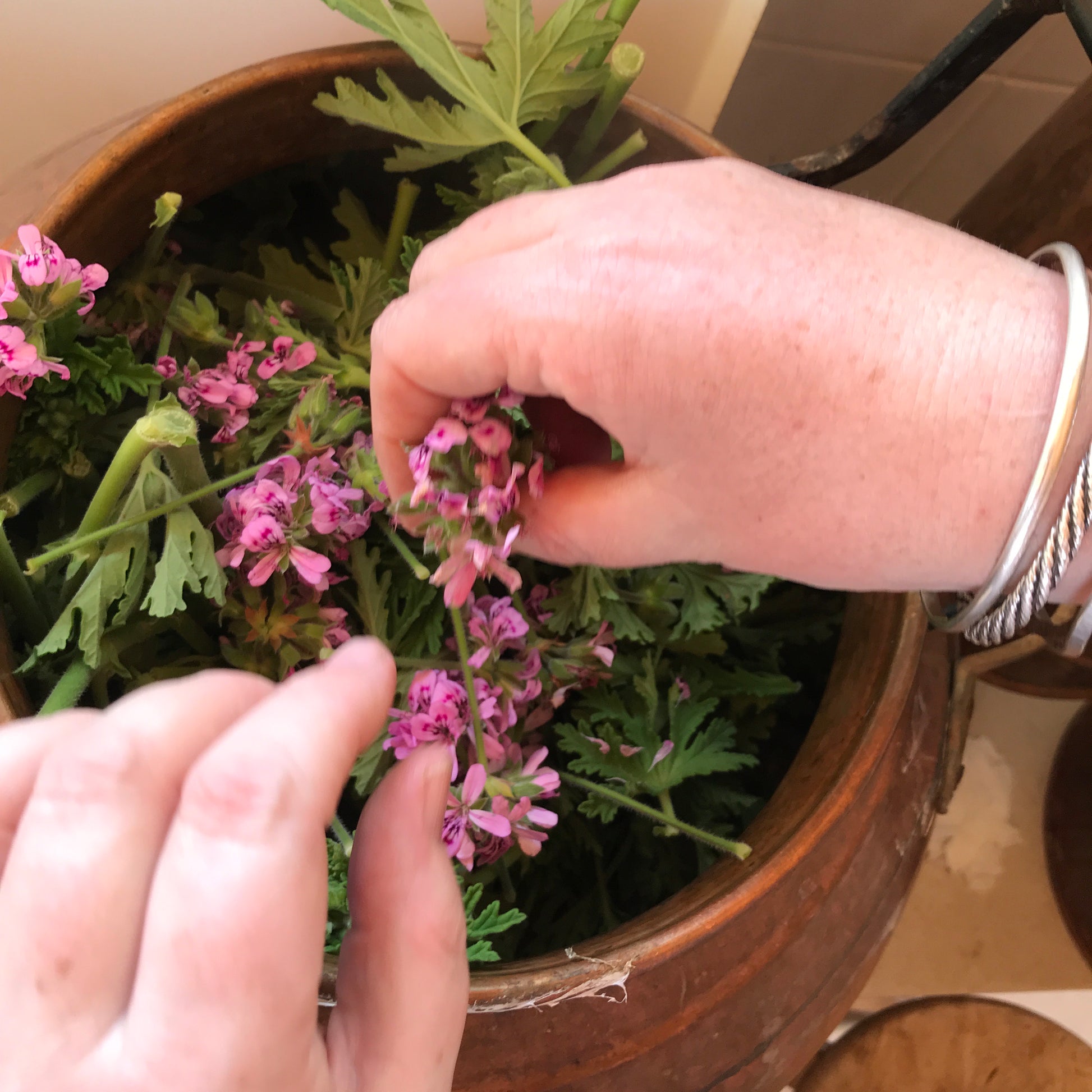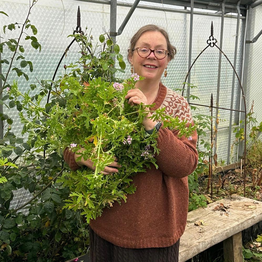 I first met Rose Geranium when I lived in Cyprus, it grew in profusion year round and was constantly covered in butterflies and bees. I recall brushing against it and immediately realised that it was a very special plant. I've worked with it for over 15 years. When I moved to Harris I brought a few cuttings with me never expecting it to thrive, but in our greenhouse it has found an ideal home. It's anti inflammatory, anti-microbial and anti-depressant .