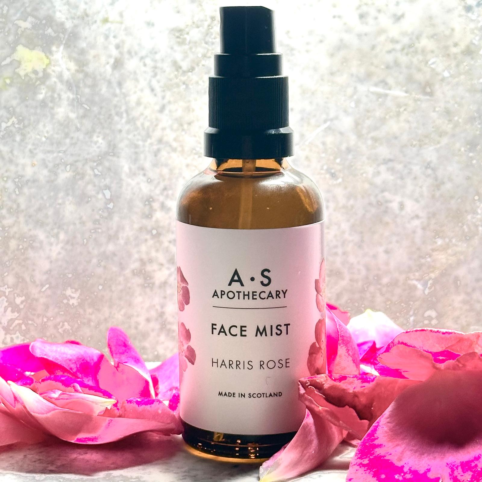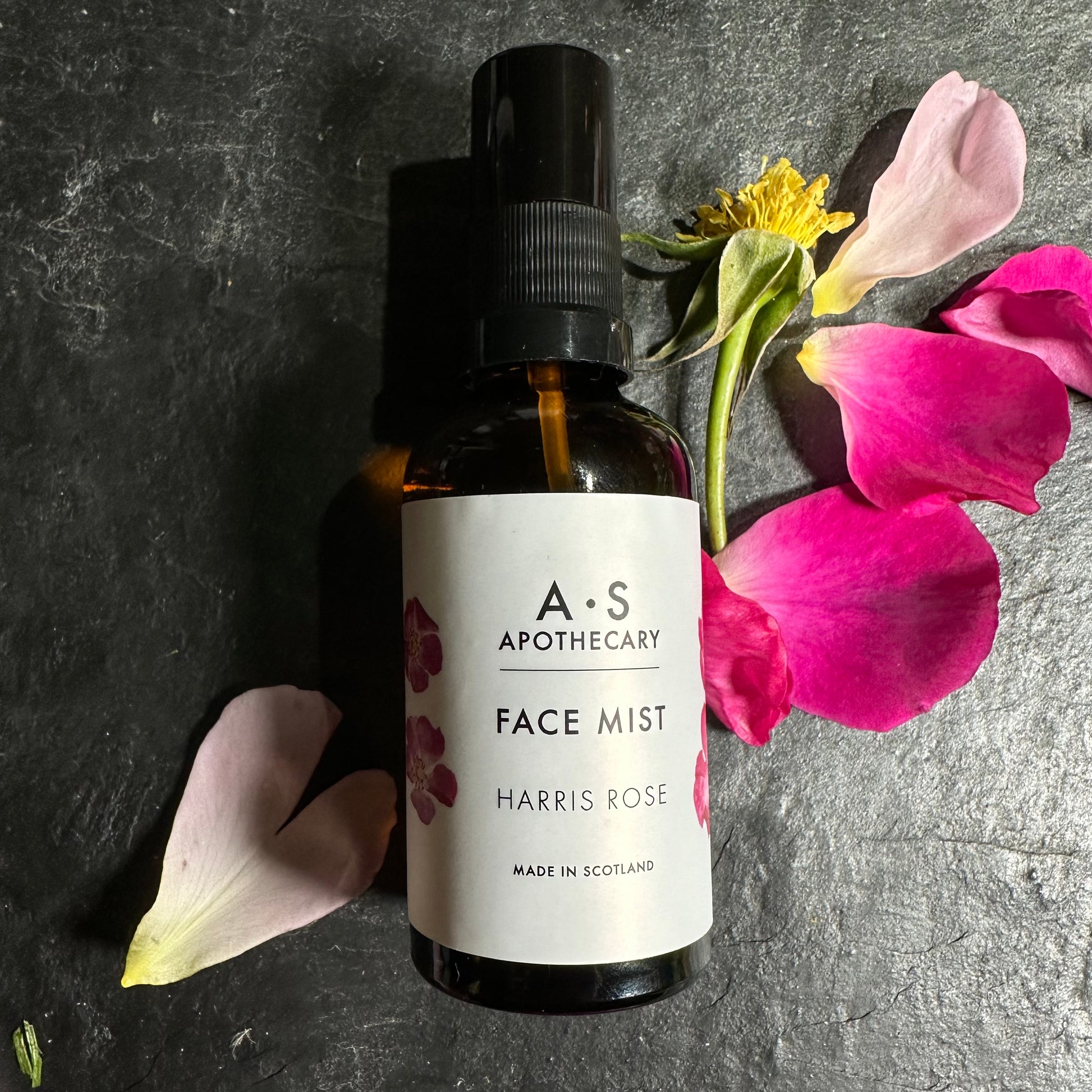 We organically grow 10 different varieties of specialist Roses in Harris and wild harvest one other which we distil in our big copper Alembic to make a beautifully scented Rose Face Mist full of therapeutic energy. Wonderfully cooling and soothing for skin prone to overheating. It is great to use when menopausal, offering a mood boost and deep, anti-inflammatory hydration for the skin.